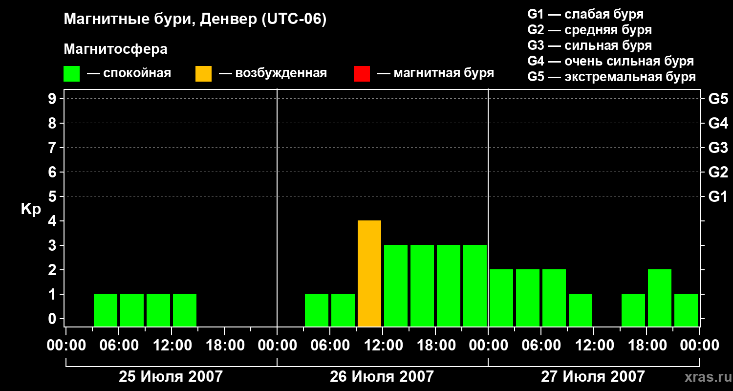 Изменения геомагнитного индекса Kp с 25 по 27 июля 2007 года для средних широт
