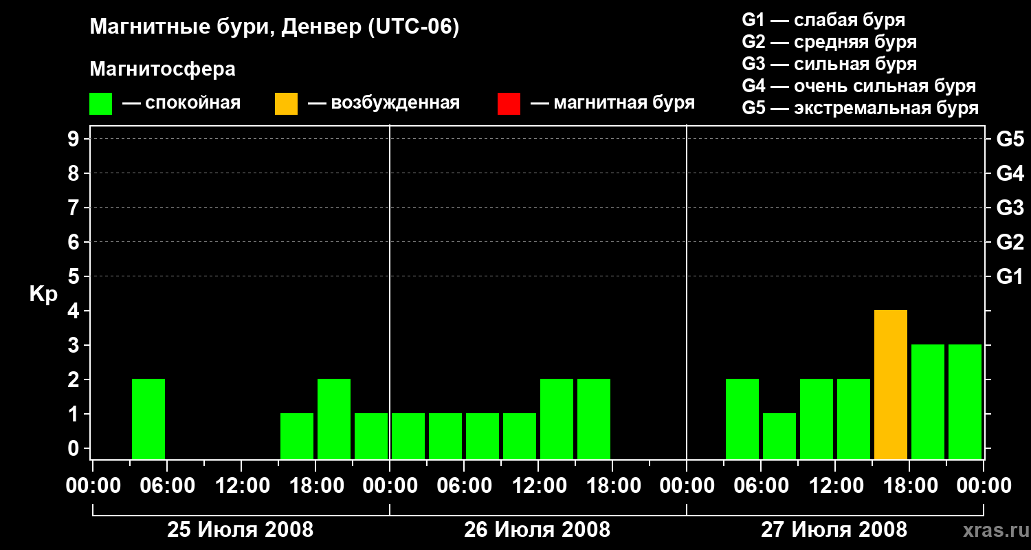 Изменения геомагнитного индекса Kp с 25 по 27 июля 2008 года для средних широт
