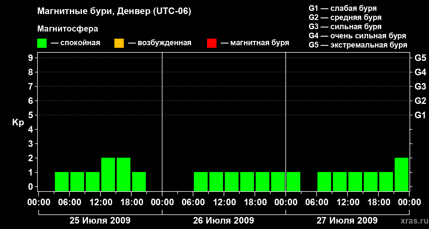 Изменения геомагнитного индекса Kp с 25 по 27 июля 2009 года для средних широт
