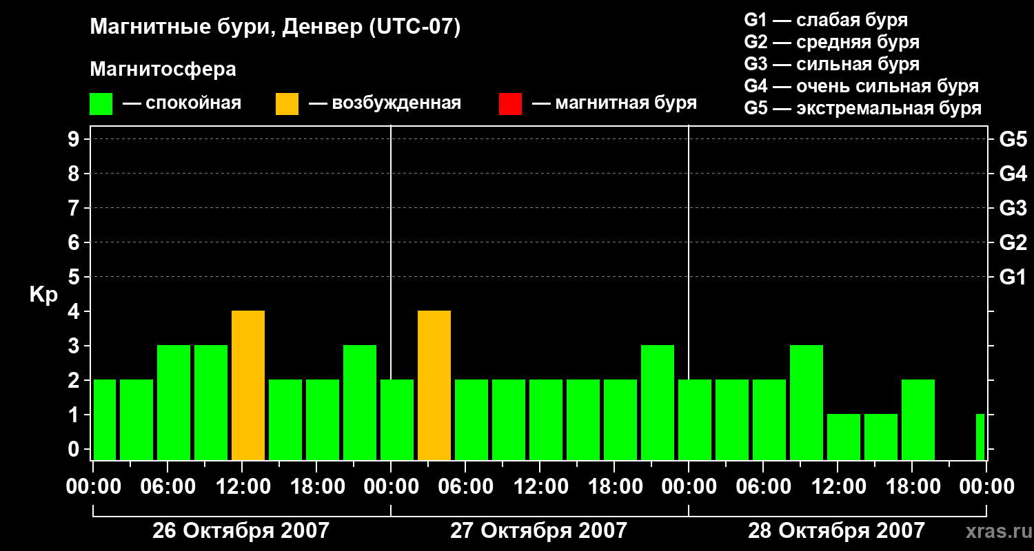 Изменения геомагнитного индекса Kp с 26 по 28 октября 2007 года для средних широт