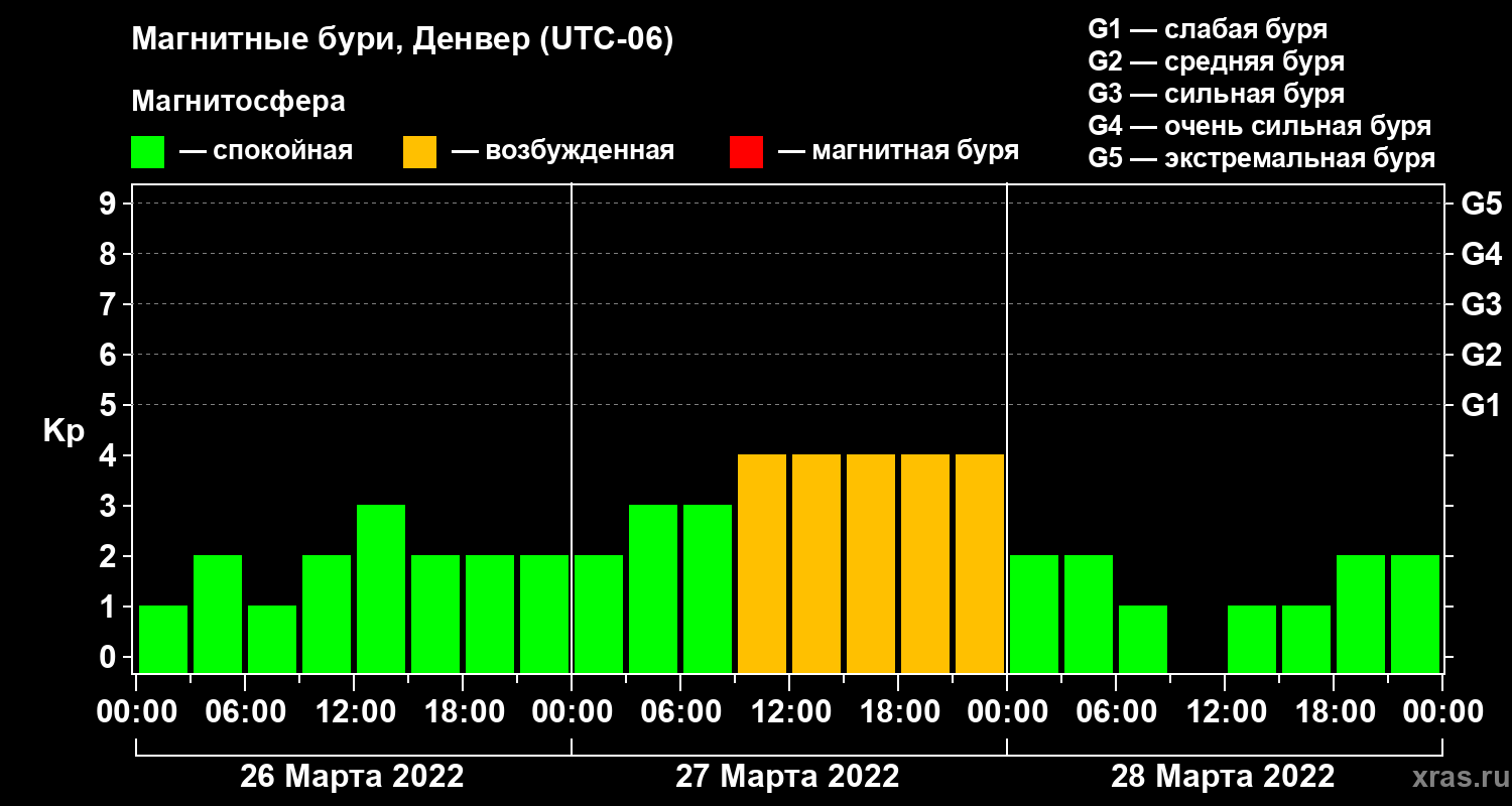 Изменения геомагнитного индекса Kp с 26 по 28 марта 2022 года для средних широт