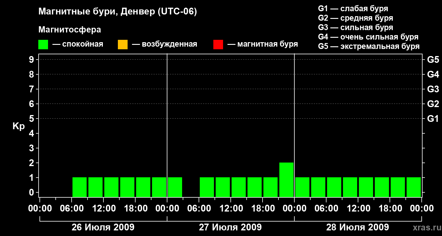 Изменения геомагнитного индекса Kp с 26 по 28 июля 2009 года для средних широт