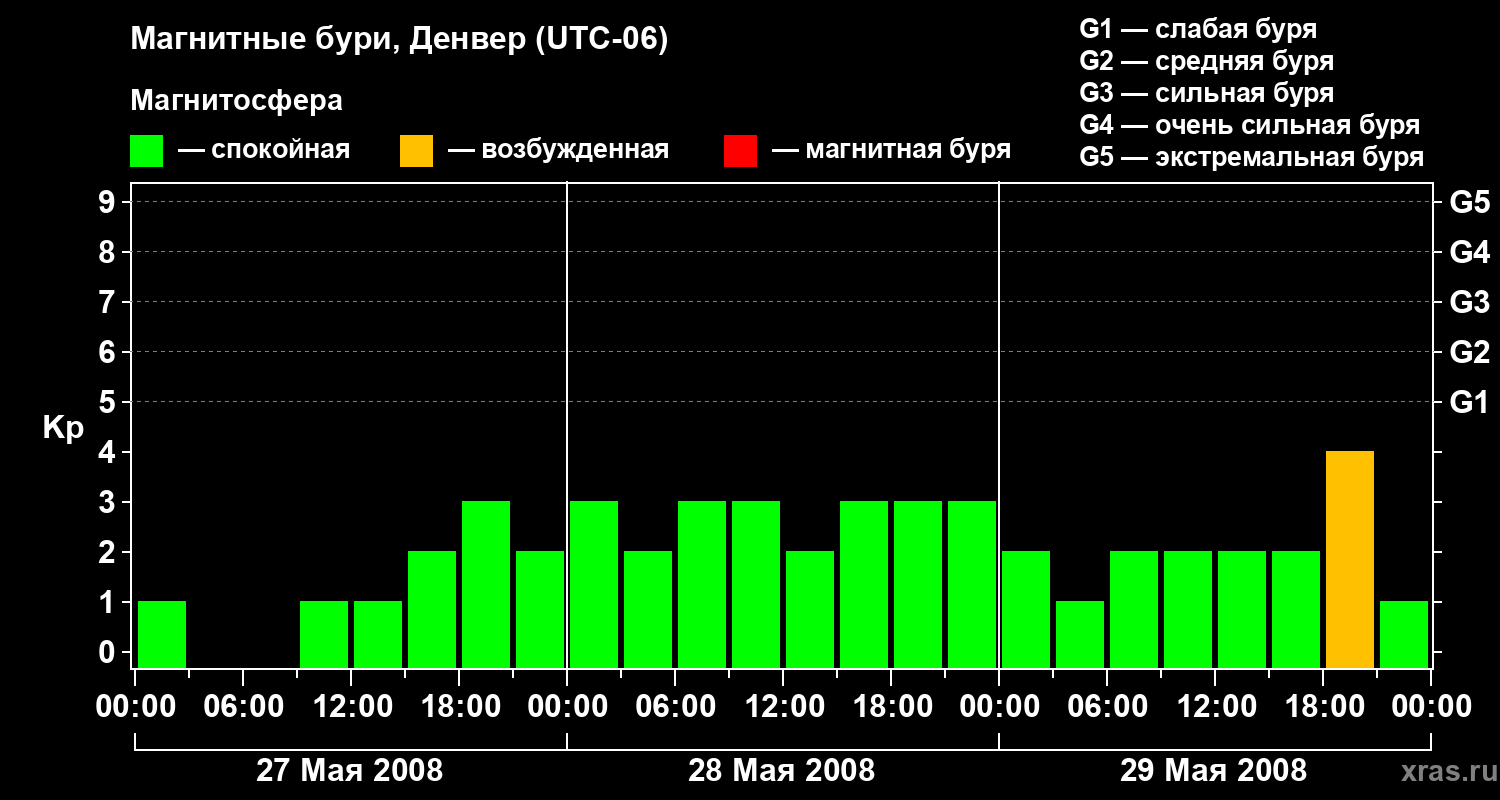 Изменения геомагнитного индекса Kp с 27 по 29 мая 2008 года для средних широт