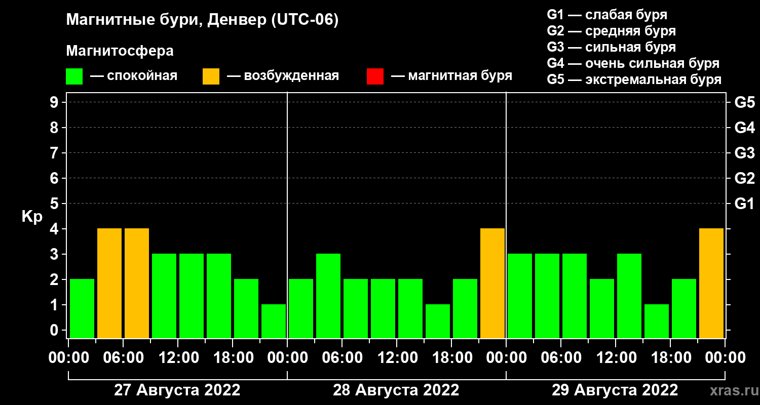 Изменения геомагнитного индекса Kp с 27 по 29 августа 2022 года для средних широт