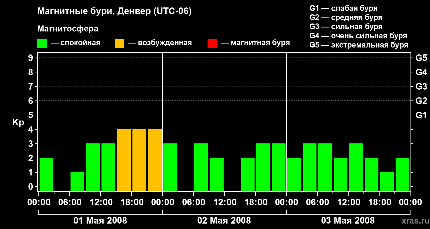 Изменения геомагнитного индекса Kp с 1 по 3 мая 2008 года для средних широт