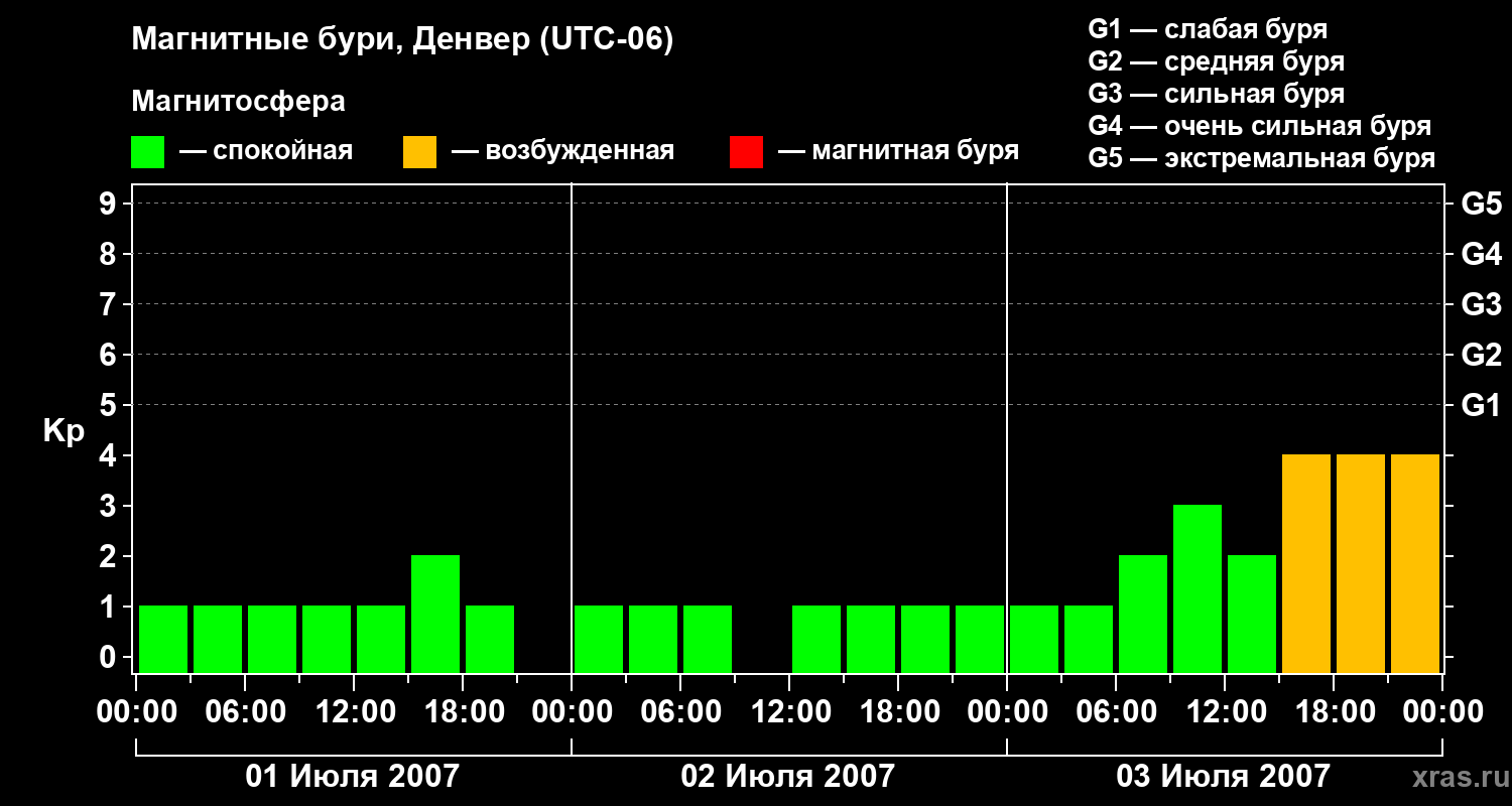 Изменения геомагнитного индекса Kp с 1 по 3 июля 2007 года для средних широт