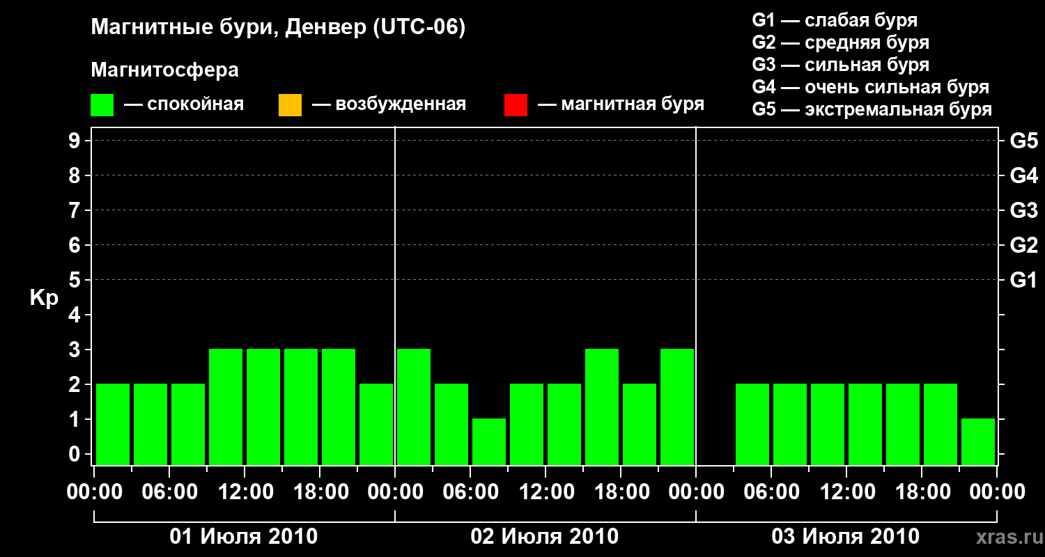 Изменения геомагнитного индекса Kp с 1 по 3 июля 2010 года для средних широт