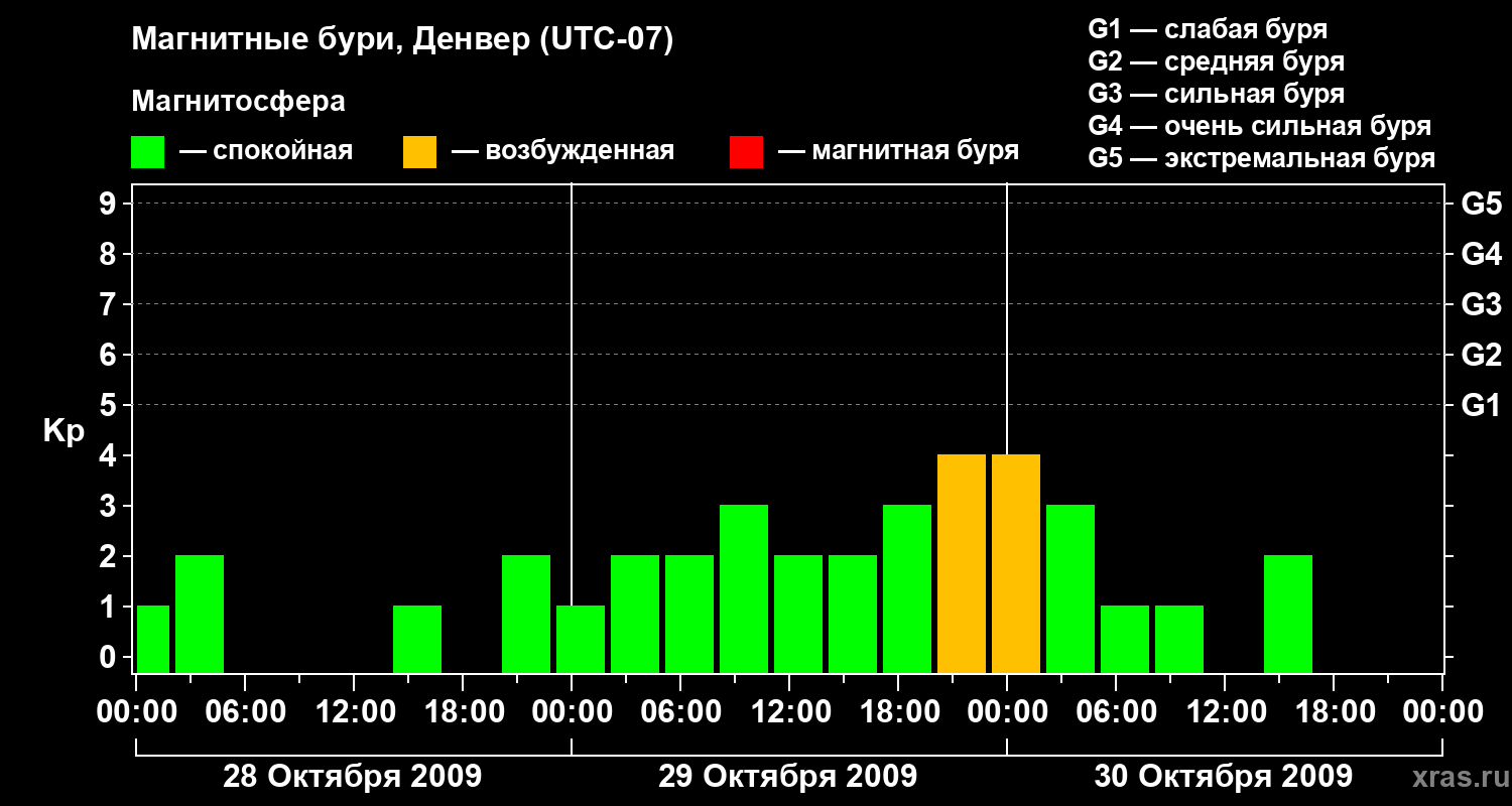 Изменения геомагнитного индекса Kp с 28 по 30 октября 2009 года для средних широт
