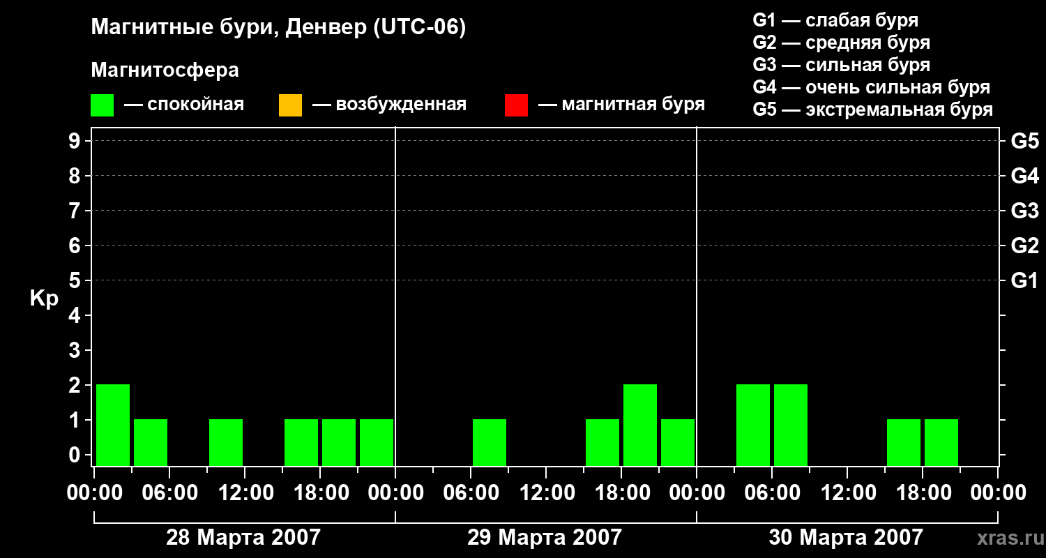 Изменения геомагнитного индекса Kp с 28 по 30 марта 2007 года для средних широт