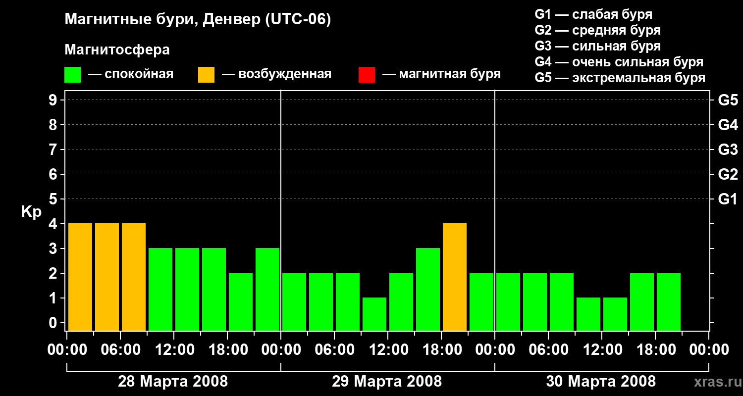 Изменения геомагнитного индекса Kp с 28 по 30 марта 2008 года для средних широт