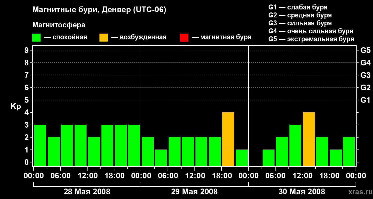 Изменения геомагнитного индекса Kp с 28 по 30 мая 2008 года для средних широт