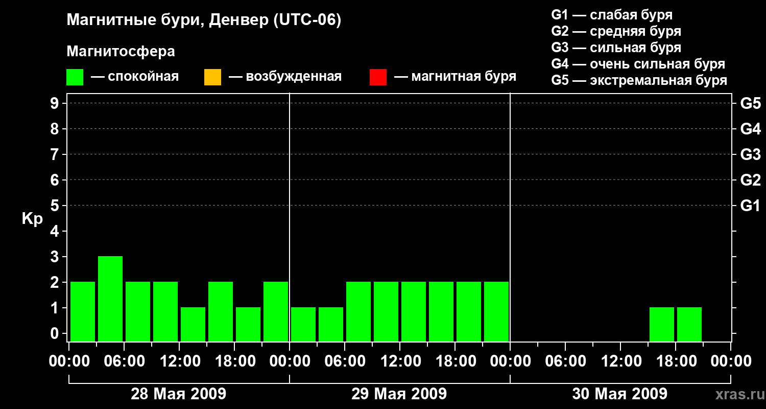 Изменения геомагнитного индекса Kp с 28 по 30 мая 2009 года для средних широт