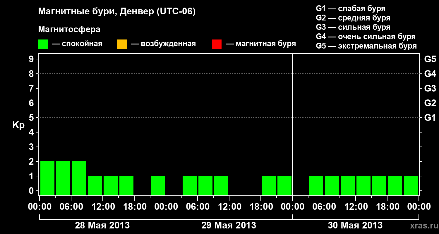 Изменения геомагнитного индекса Kp с 28 по 30 мая 2013 года для средних широт
