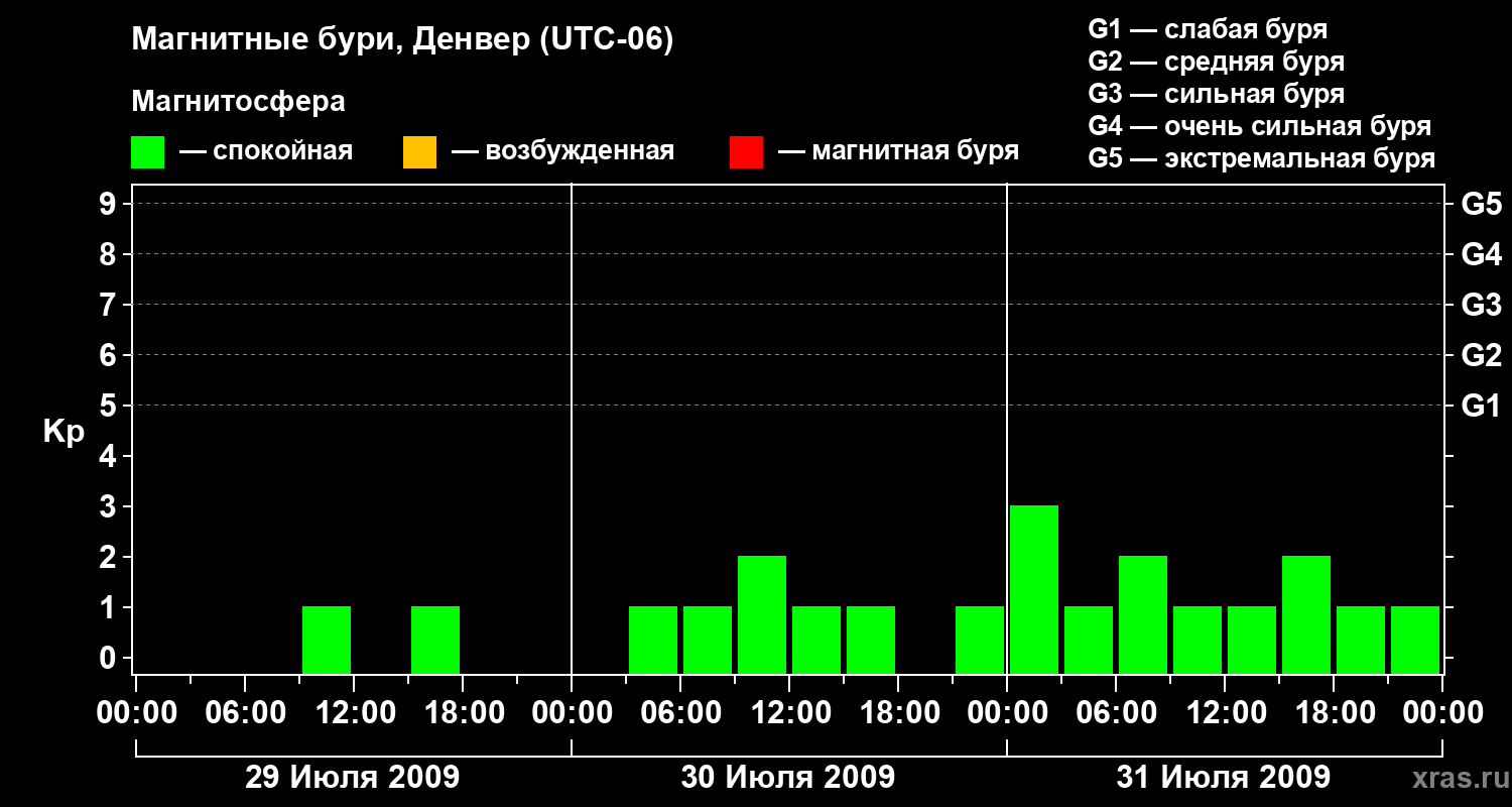 Изменения геомагнитного индекса Kp с 29 по 31 июля 2009 года для средних широт