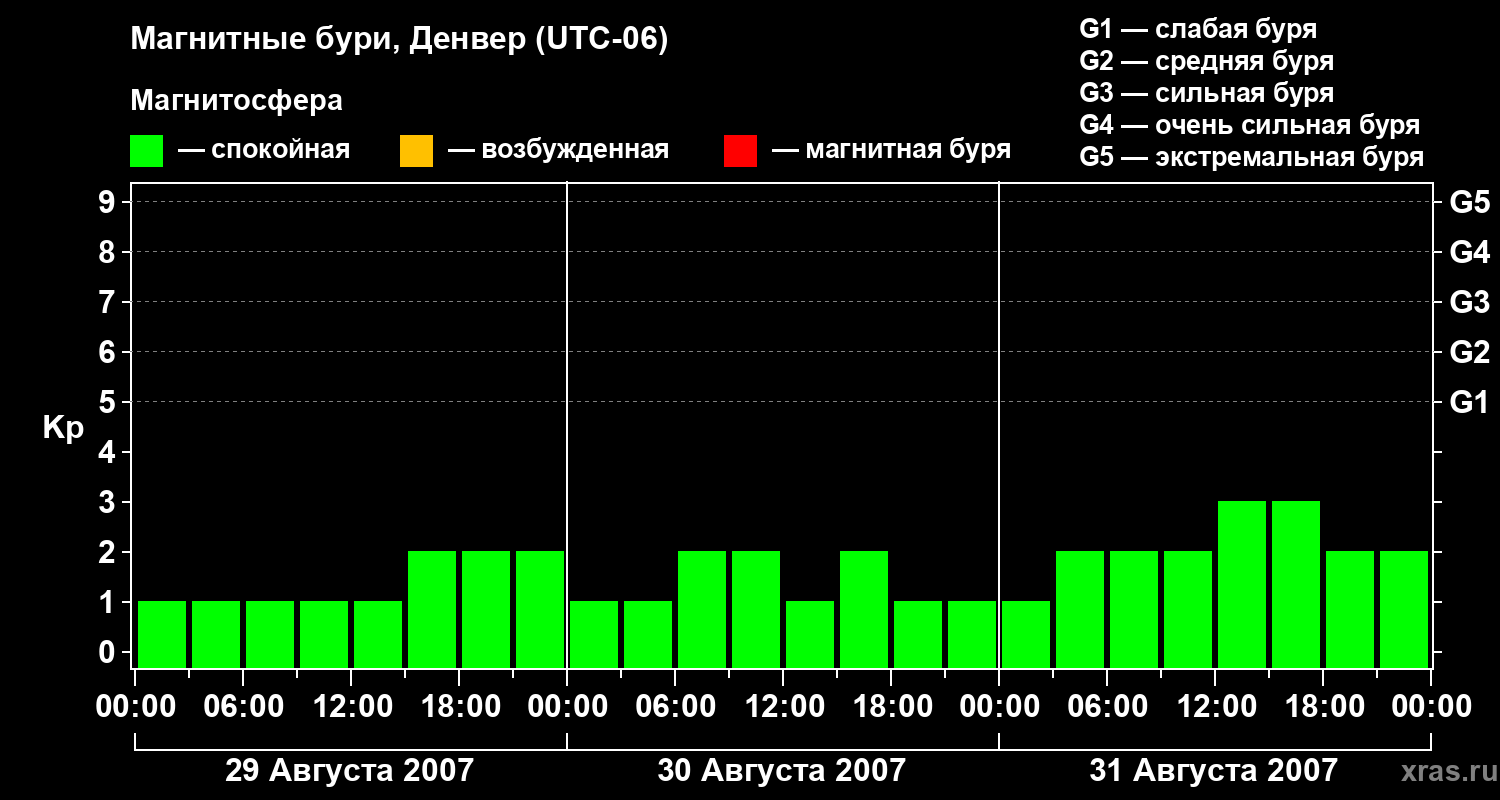 Изменения геомагнитного индекса Kp с 29 по 31 августа 2007 года для средних широт