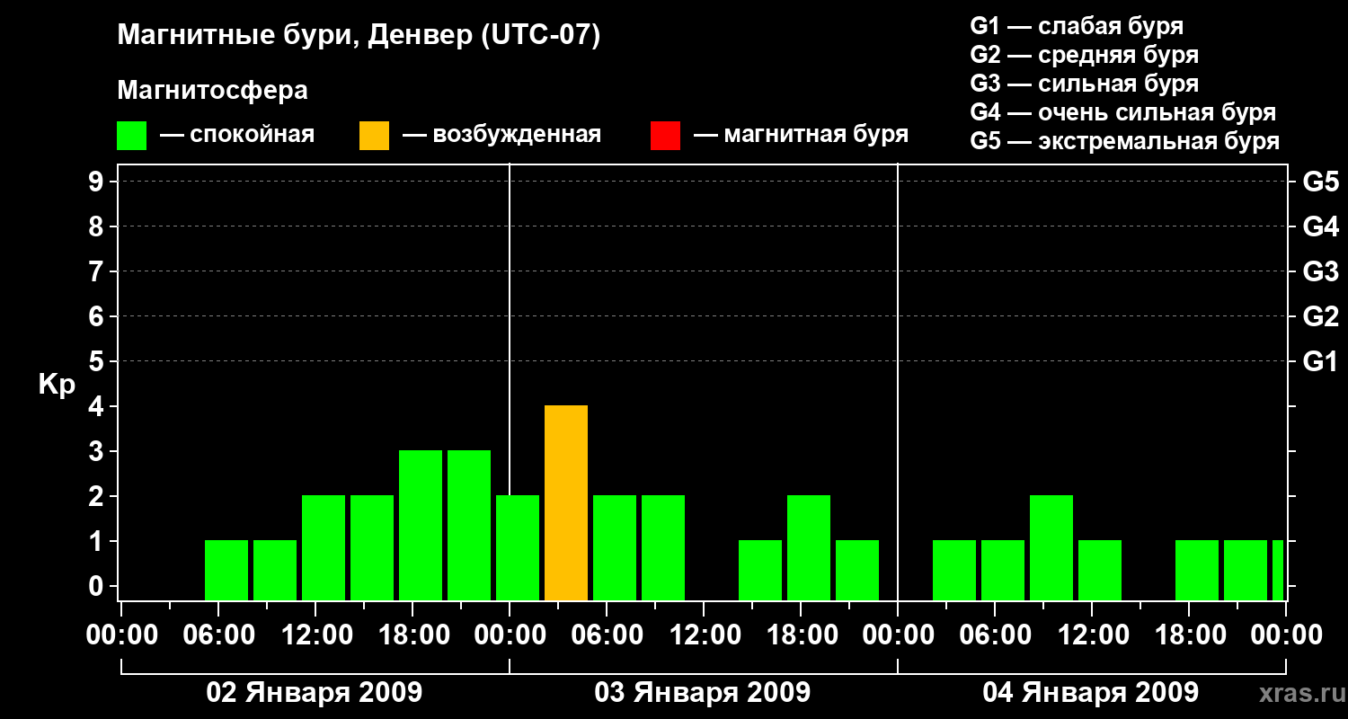 Изменения геомагнитного индекса Kp с 2 по 4 января 2009 года для средних широт