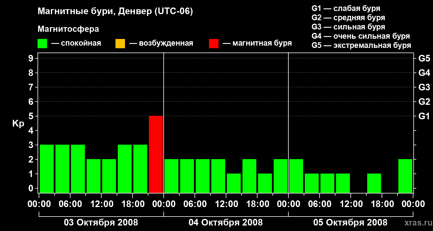 Изменения геомагнитного индекса Kp с 3 по 5 октября 2008 года для средних широт