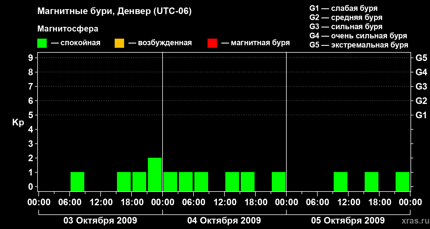 Изменения геомагнитного индекса Kp с 3 по 5 октября 2009 года для средних широт