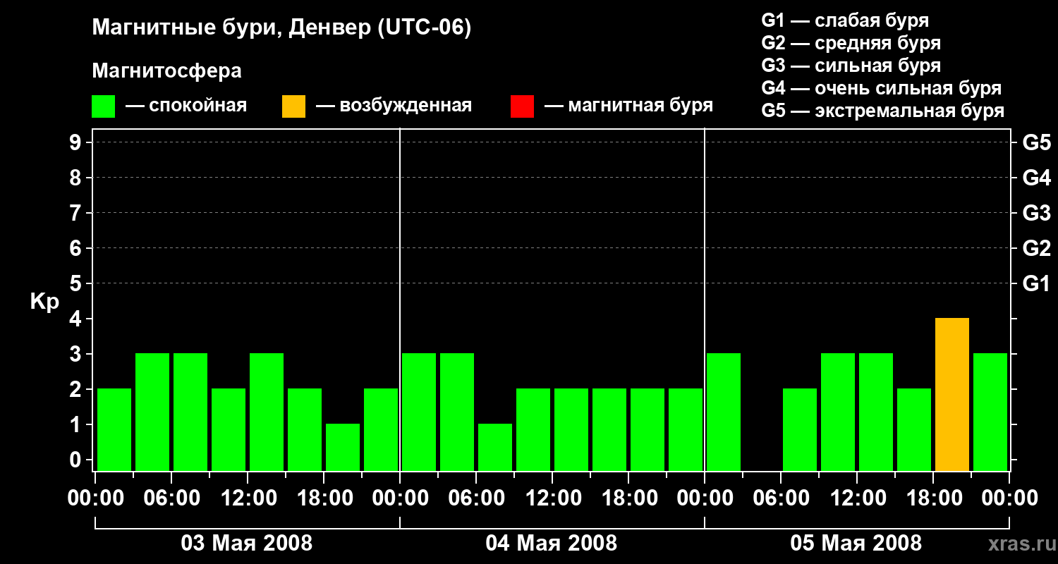 Изменения геомагнитного индекса Kp с 3 по 5 мая 2008 года для средних широт