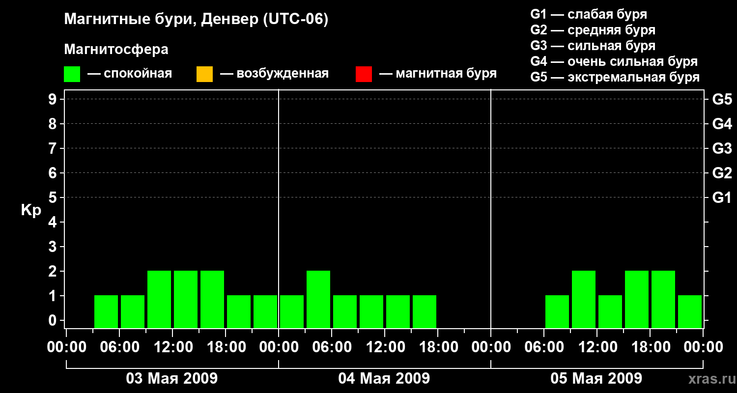 Изменения геомагнитного индекса Kp с 3 по 5 мая 2009 года для средних широт