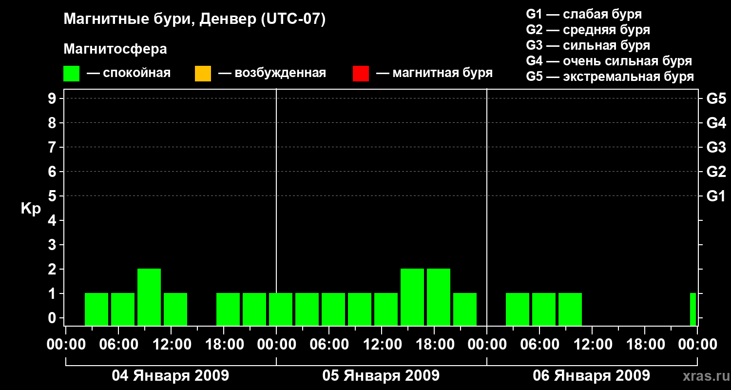 Изменения геомагнитного индекса Kp с 4 по 6 января 2009 года для средних широт