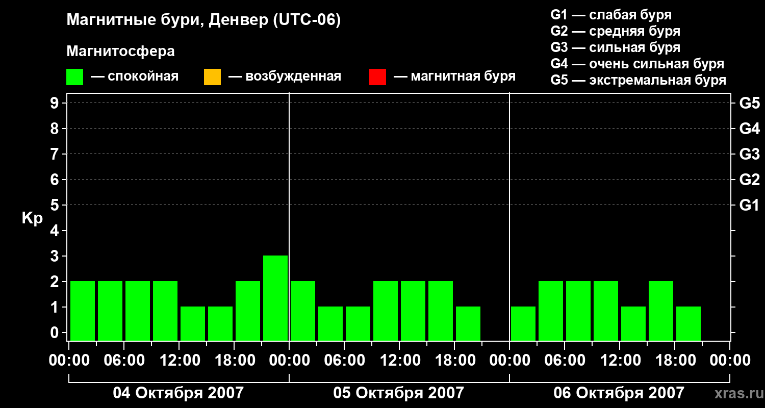 Изменения геомагнитного индекса Kp с 4 по 6 октября 2007 года для средних широт
