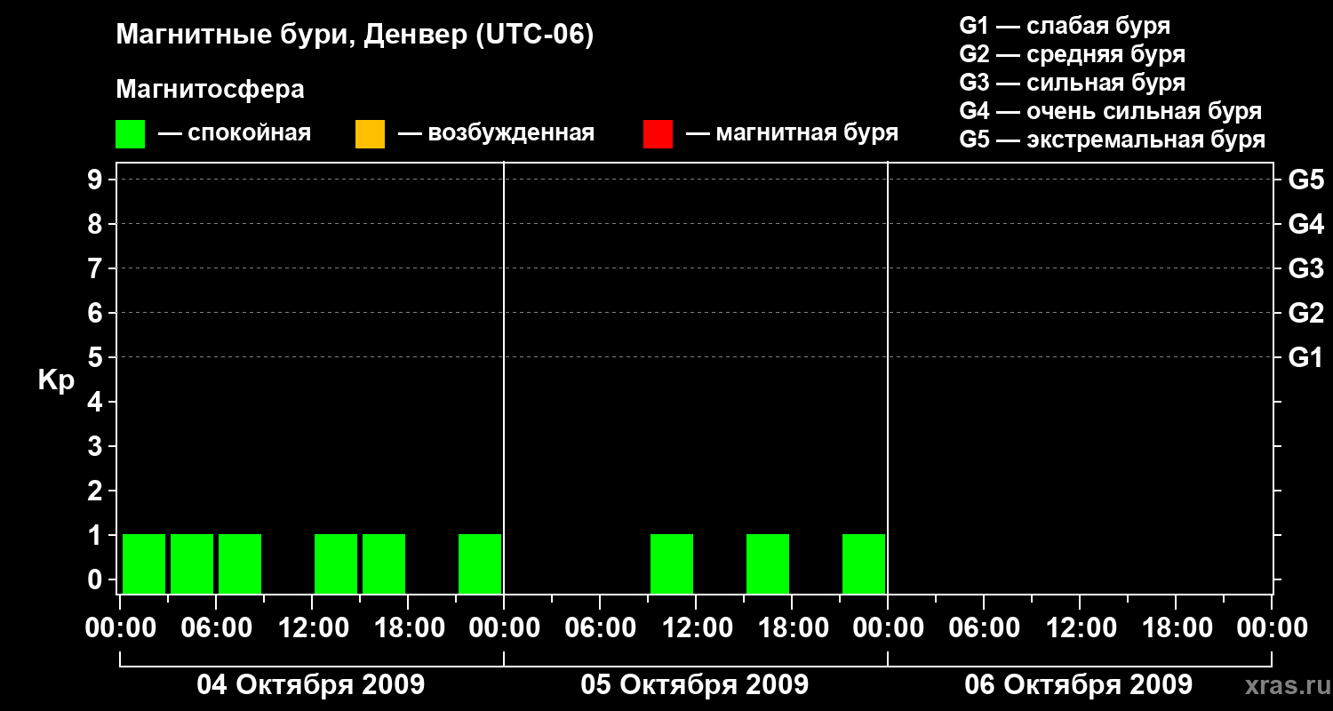 Изменения геомагнитного индекса Kp с 4 по 6 октября 2009 года для средних широт
