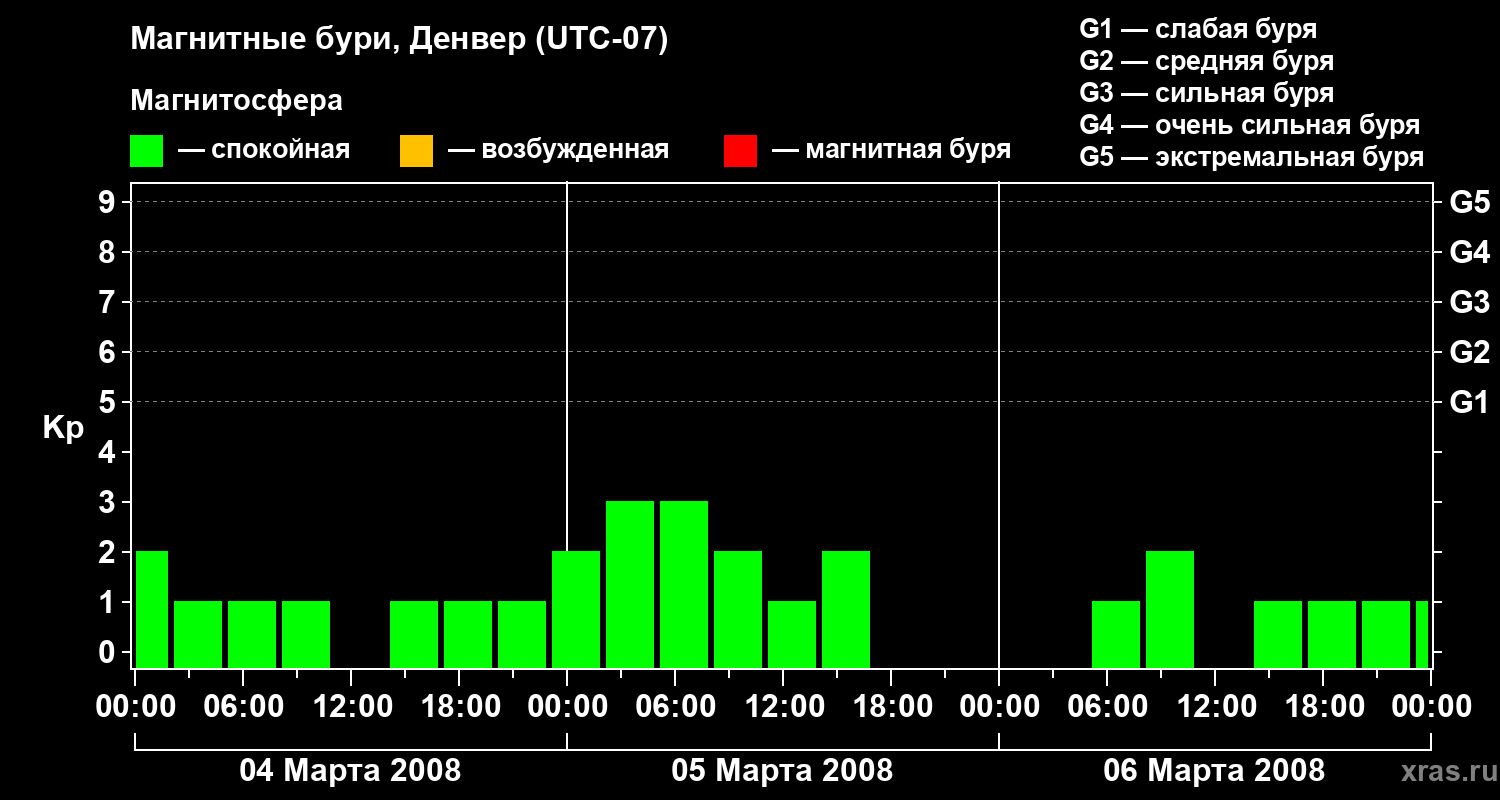 Изменения геомагнитного индекса Kp с 4 по 6 марта 2008 года для средних широт