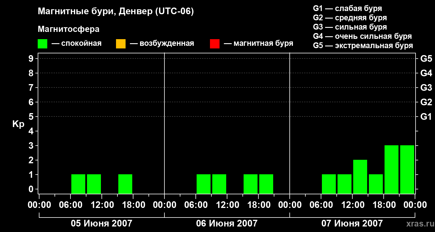 Изменения геомагнитного индекса Kp с 5 по 7 июня 2007 года для средних широт