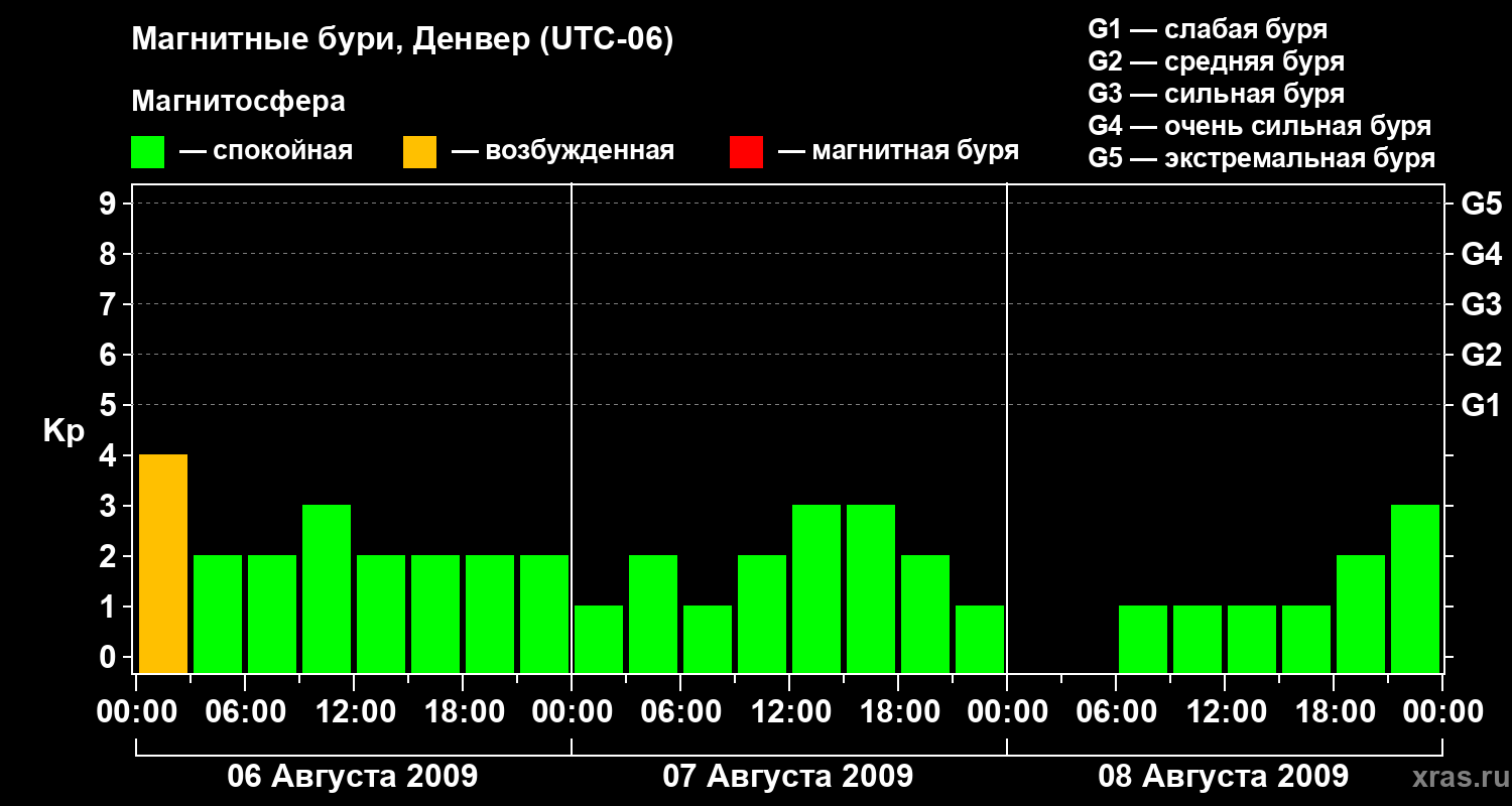 Изменения геомагнитного индекса Kp с 6 по 8 августа 2009 года для средних широт