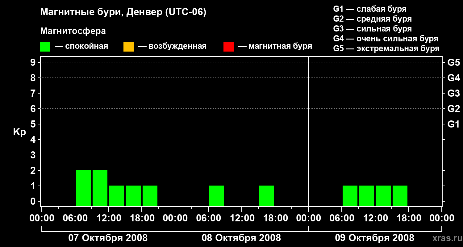 Изменения геомагнитного индекса Kp с 7 по 9 октября 2008 года для средних широт