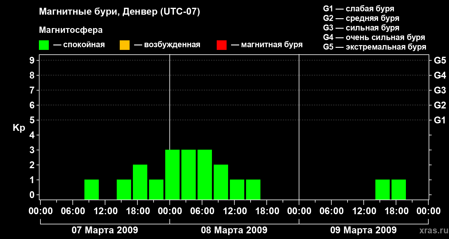 Изменения геомагнитного индекса Kp с 7 по 9 марта 2009 года для средних широт