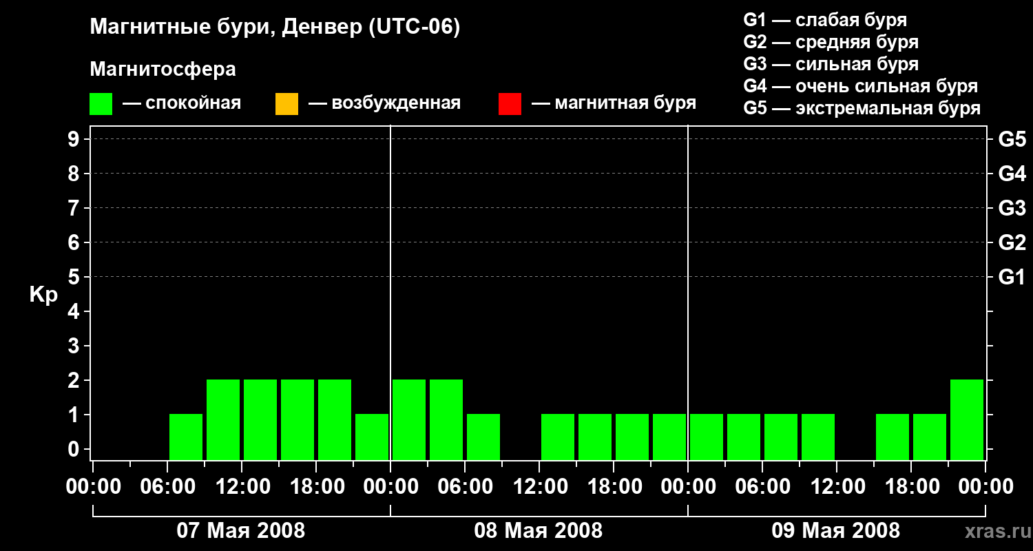 Изменения геомагнитного индекса Kp с 7 по 9 мая 2008 года для средних широт