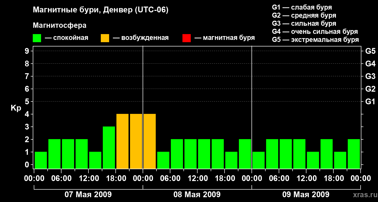 Изменения геомагнитного индекса Kp с 7 по 9 мая 2009 года для средних широт