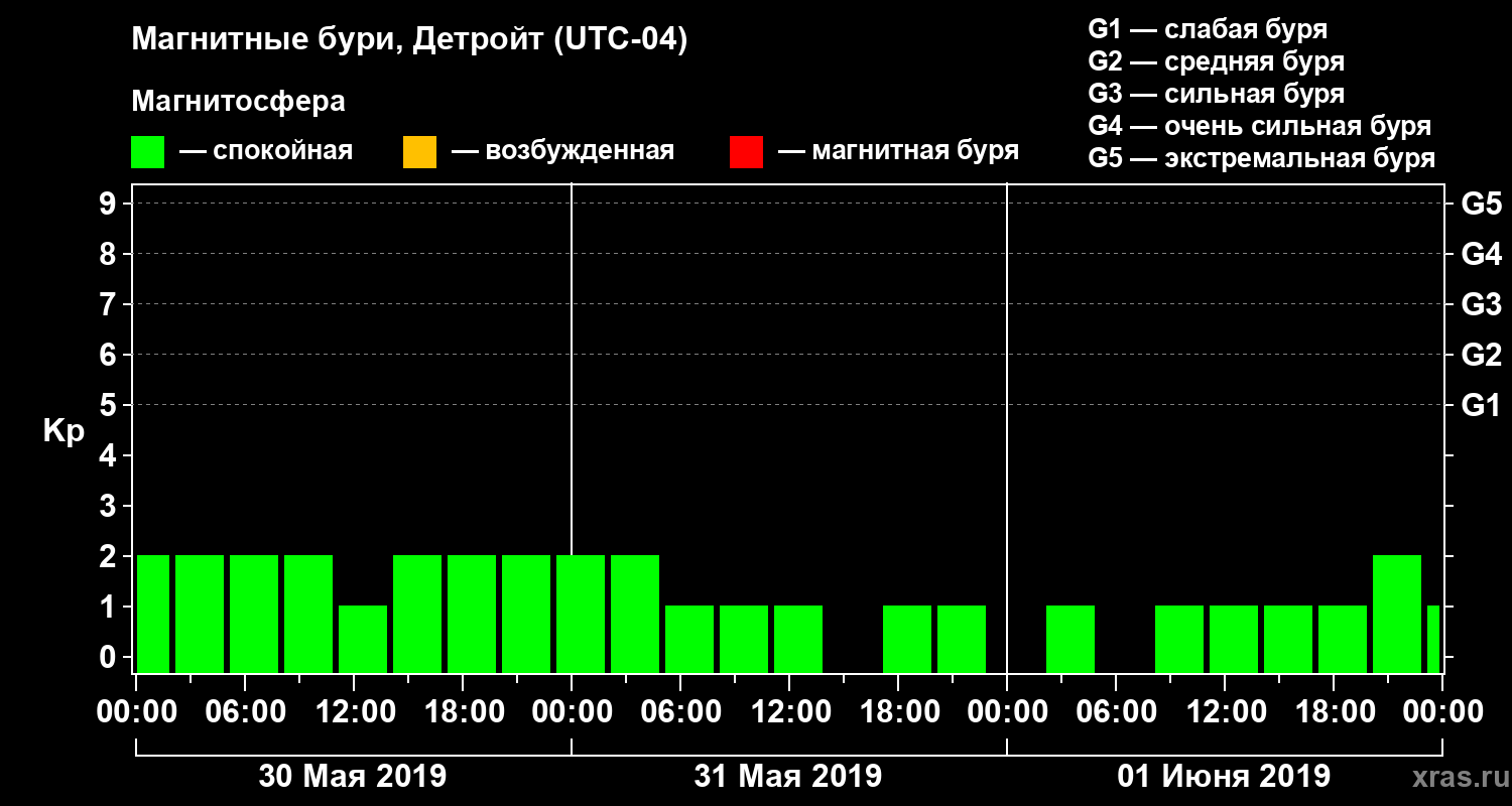 Изменения геомагнитного индекса Kp с 30 мая по 1 июня 2019 года для средних широт