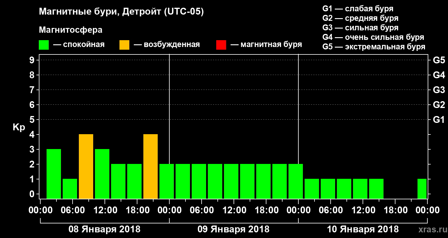 Изменения геомагнитного индекса Kp с 8 по 10 января 2018 года для средних широт