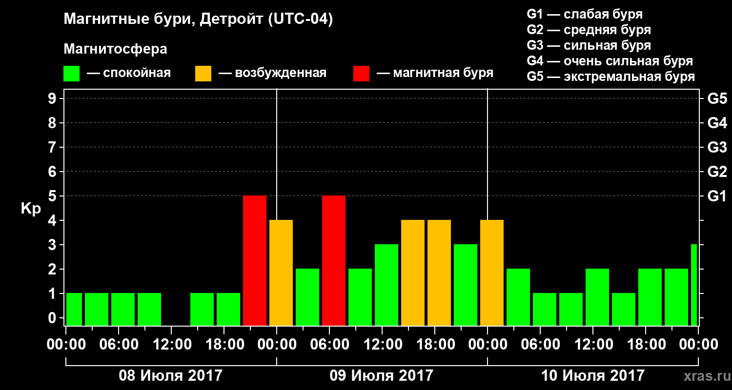 Изменения геомагнитного индекса Kp с 8 по 10 июля 2017 года для средних широт