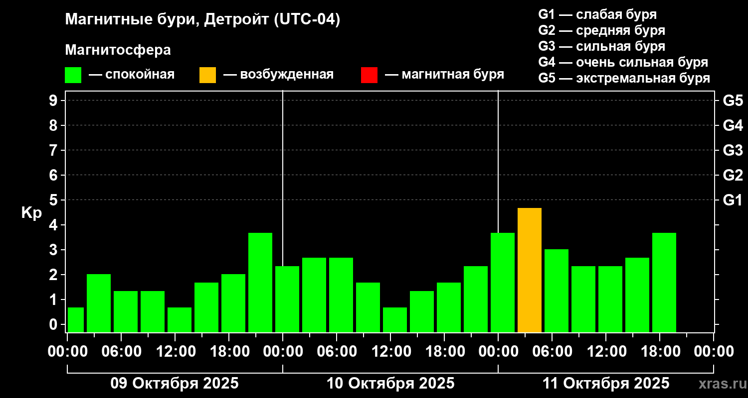 Изменения геомагнитного индекса Kp с 9 по 11 октября 2025 года для средних широт