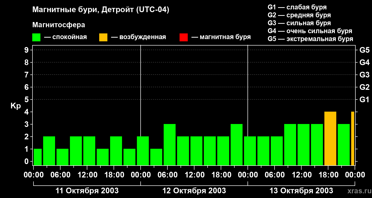 Изменения геомагнитного индекса Kp с 11 по 13 октября 2003 года для средних широт