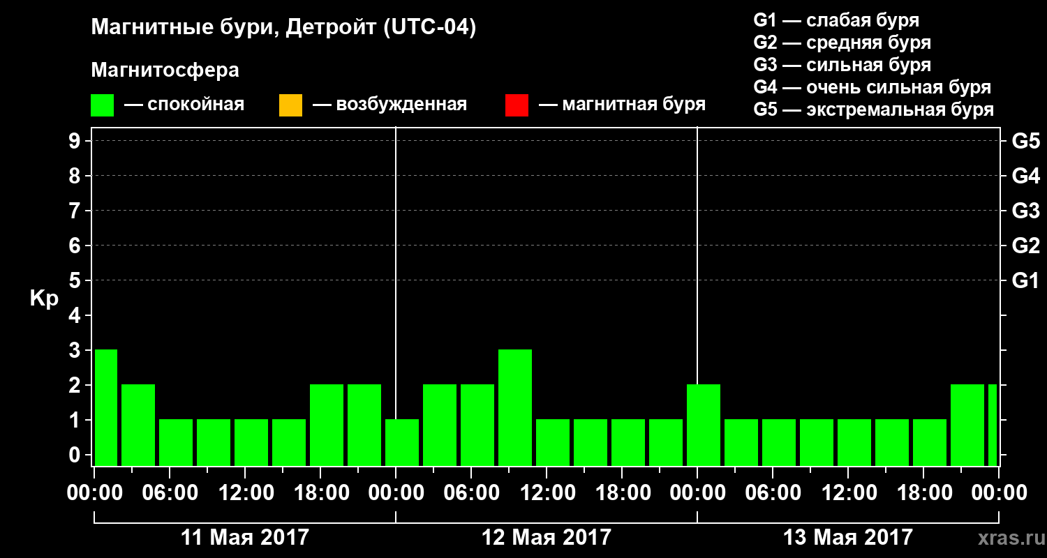 Изменения геомагнитного индекса Kp с 11 по 13 мая 2017 года для средних широт
