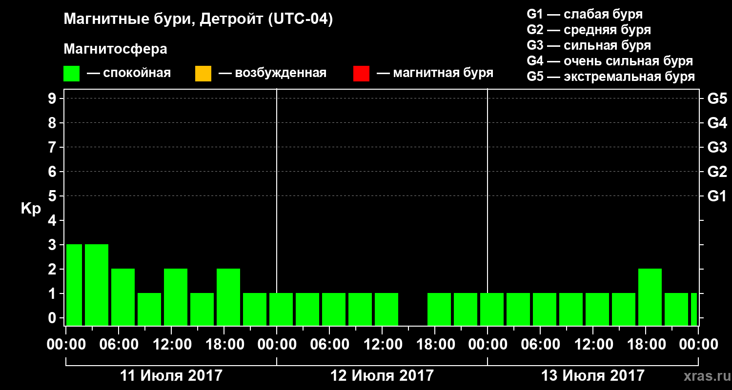 Изменения геомагнитного индекса Kp с 11 по 13 июля 2017 года для средних широт