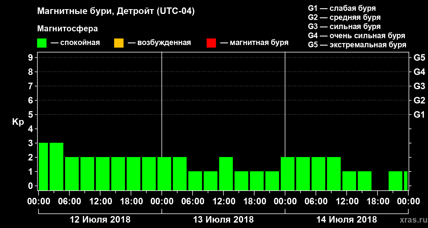 Изменения геомагнитного индекса Kp с 12 по 14 июля 2018 года для средних широт