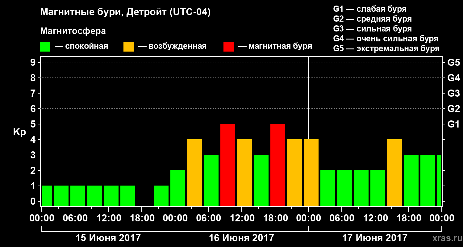 Изменения геомагнитного индекса Kp с 15 по 17 июня 2017 года для средних широт