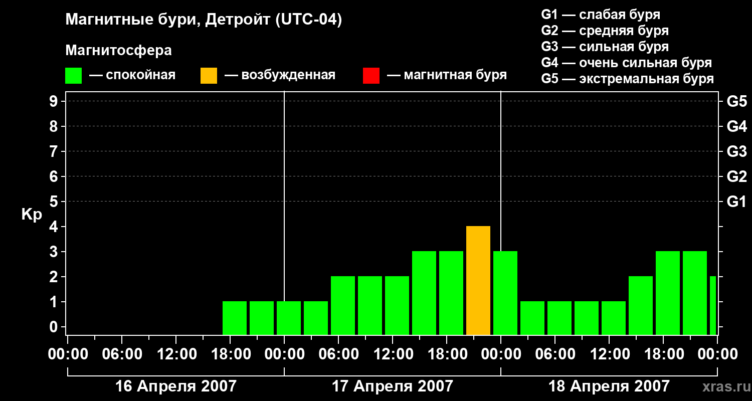 Изменения геомагнитного индекса Kp с 16 по 18 апреля 2007 года для средних широт