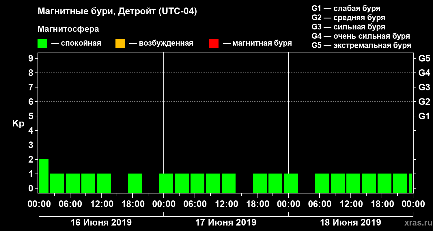 Изменения геомагнитного индекса Kp с 16 по 18 июня 2019 года для средних широт