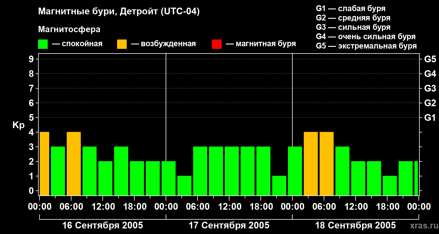 Изменения геомагнитного индекса Kp с 16 по 18 сентября 2005 года для средних широт