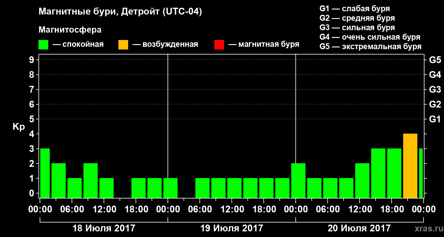 Изменения геомагнитного индекса Kp с 18 по 20 июля 2017 года для средних широт