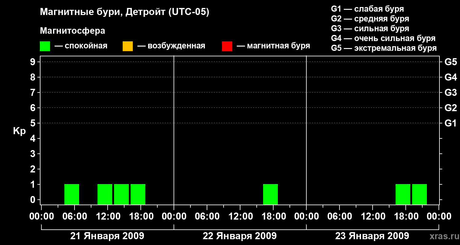 Изменения геомагнитного индекса Kp с 21 по 23 января 2009 года для средних широт