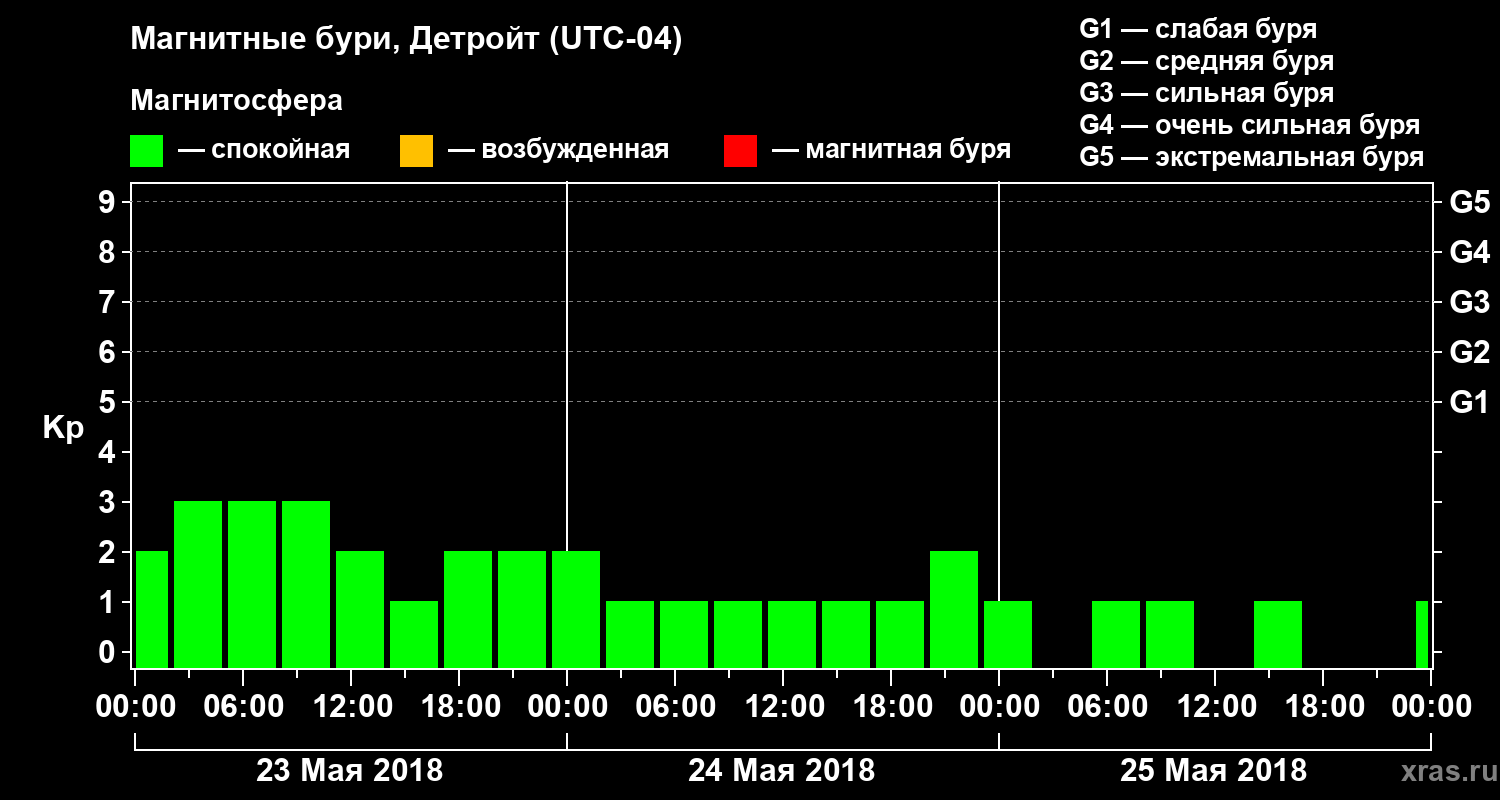 Изменения геомагнитного индекса Kp с 23 по 25 мая 2018 года для средних широт