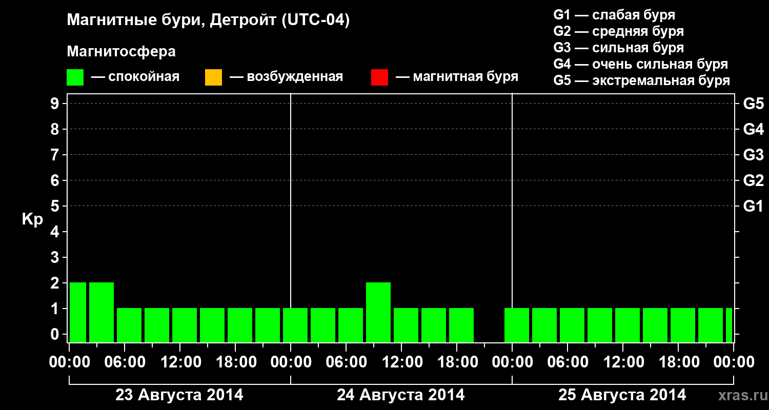 Изменения геомагнитного индекса Kp с 23 по 25 августа 2014 года для средних широт